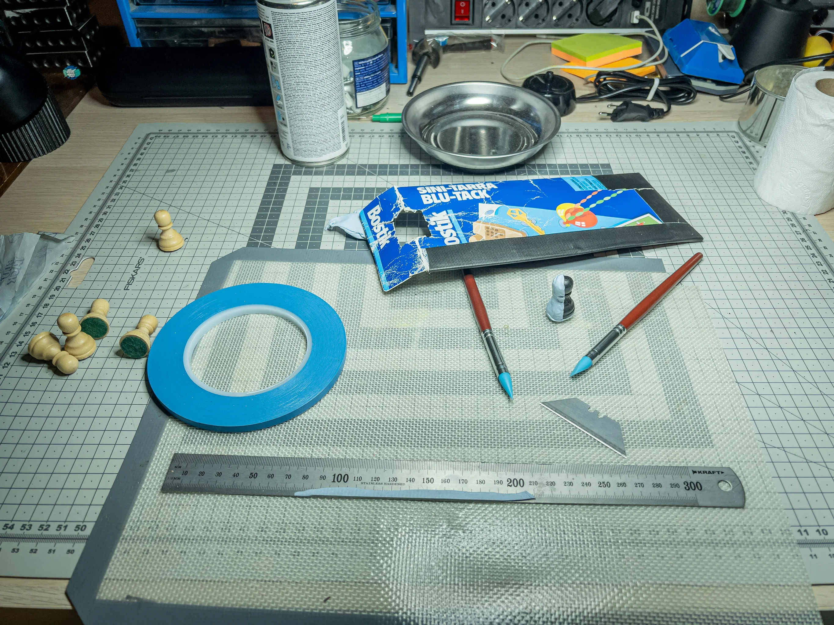The white pieces were light wood and took the spray paint well. For the black piece, I masked it with Blu Tack, since the curves were too deep for tape. I sprayed it with white paint, but it reacted oddly, so I had to finish it by hand.