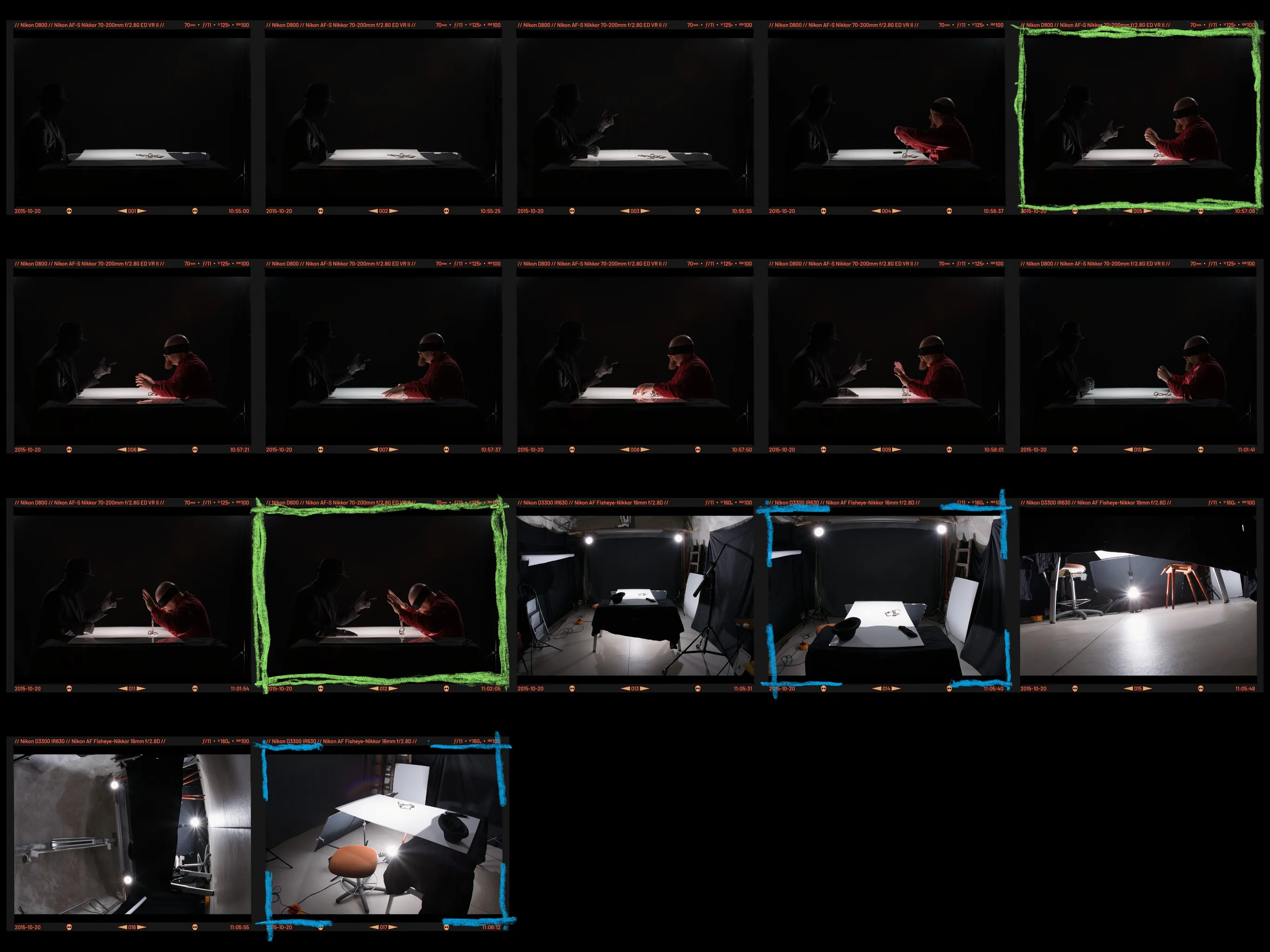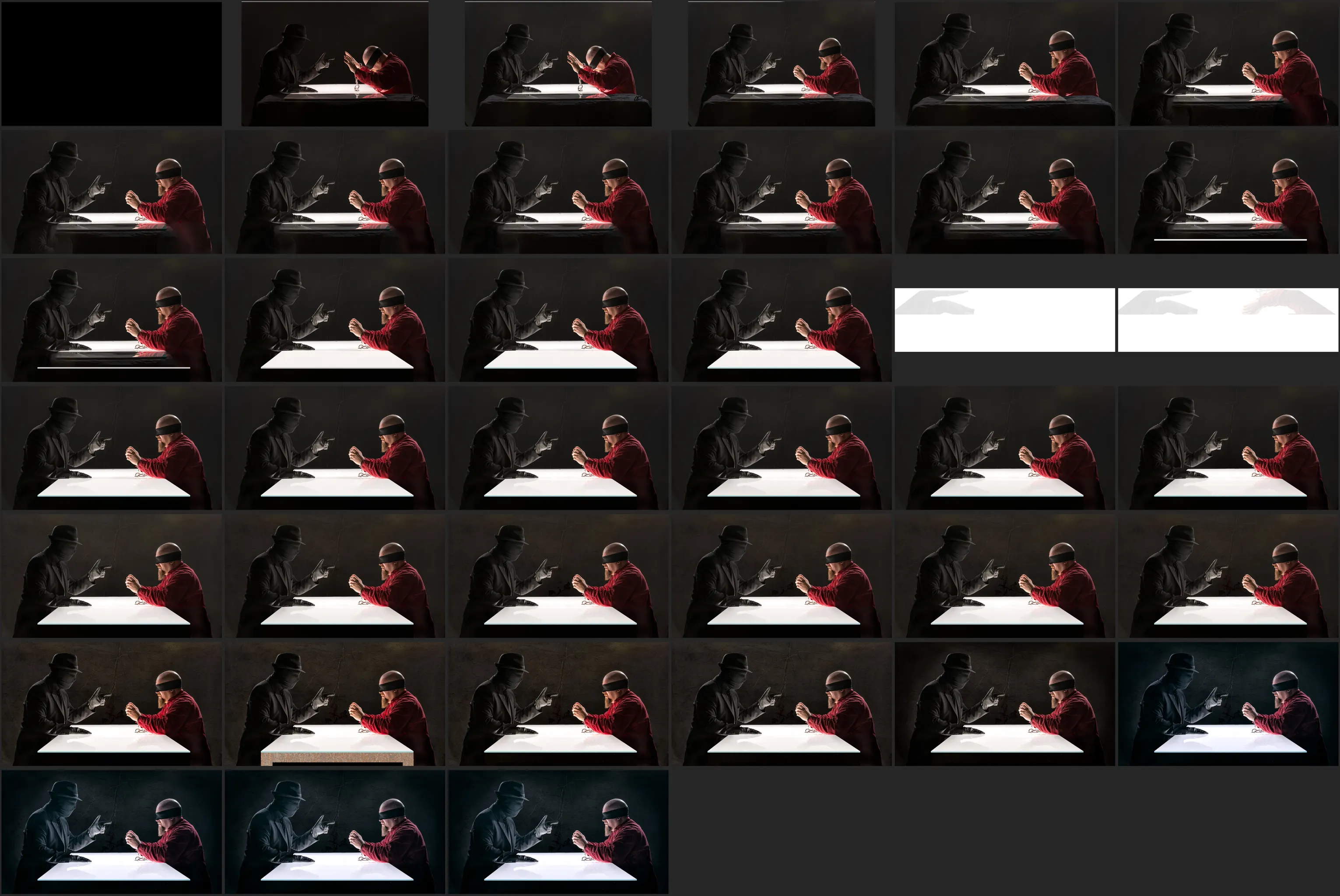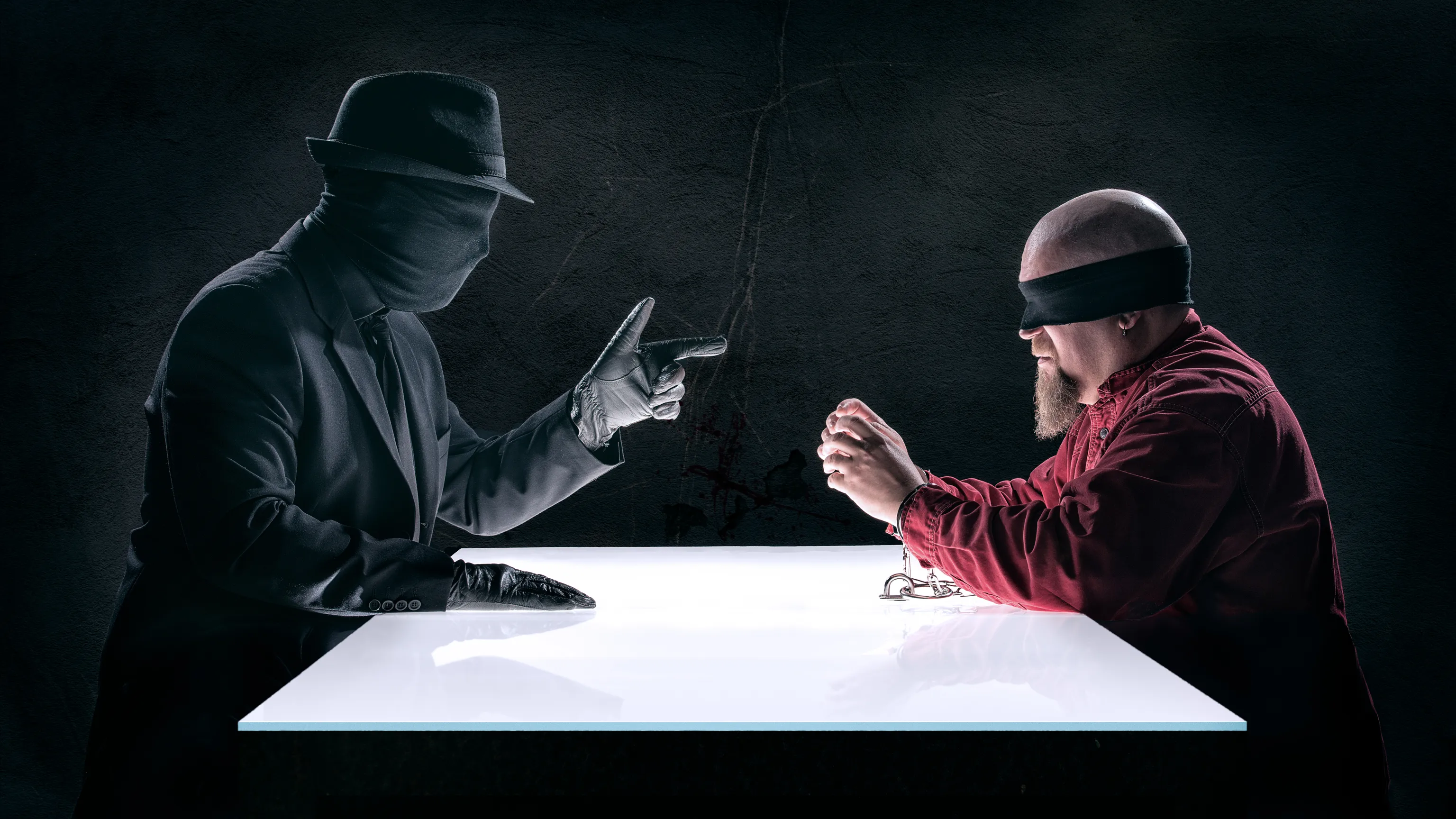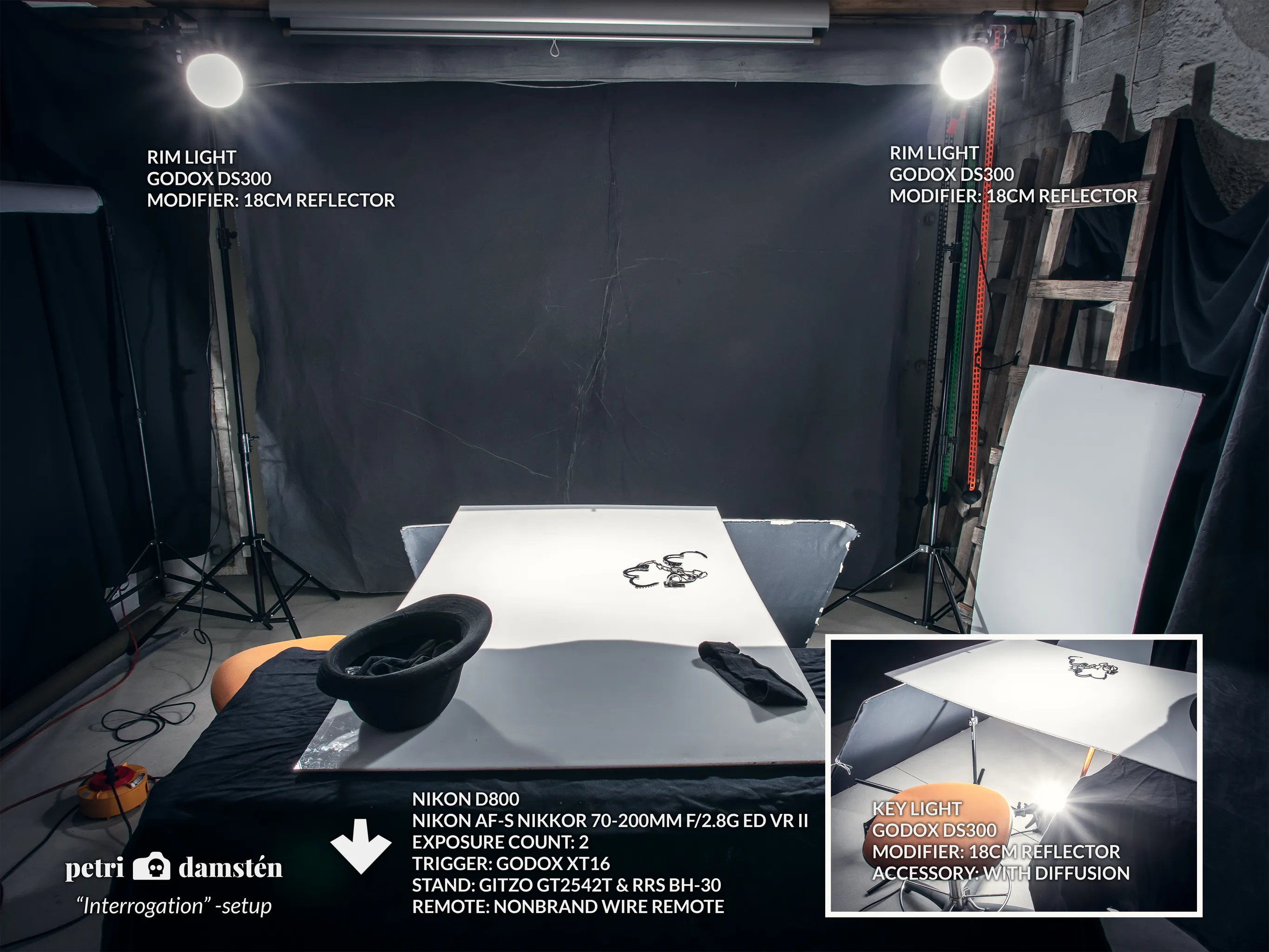 I already had all the props except the chain and loop for the handcuffs, which I bought the same day. We used white plexiglass for the table and placed one light underneath it. I added a couple of kickers, and the setup was ready.